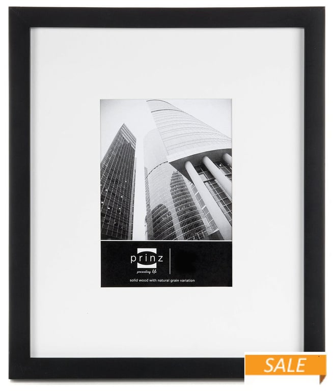 Main view Detail Product Details Prinz® frames & albums AVENIR STANDARD Black pine gallery 11x14/8x10 frame with white mat by Prinz — Create Decorator Quality wall displays of your prized photos with the AVENIR Gallery series of professional quality frames. Turn spaces into places with an artful arrangement of musem-quality, matted, wood frames; display en masse on walls, ledges or mantels. Here, select black stained natural pine is matched with an acid free, bevelled mat of superior quality. Holds an 8x10" image with matting and an 11"x14" image without.Wall mounts for easy hanging. Glare resistant glass lens.By Prinz®. AVENIR STANDARD Black pine gallery 11x14/8x10 frame with white mat by Prinz Model #086981758857 List $45.00 You pay $20.90 In stock Ships next business day [?] Your Price Match is Active Your request for a price of $0.00 for a minimum quantity of has been accepted. You have [time] left to purchase this item for $0.00 instead of $20.90 each. Find a Lower Price? We BEAT All Authorized Retailers [?] FEATURESDisplays:8"x10"Material:Wood (full grain)Finish:BlackOccasion:Business & office, Home decoratingStyle:Classic, Contemporary, TraditionalOrientation:BothBrand:Prinz® frames & albumsDisplay Type:Wall Only Approx. Overall Dimensions:14"x16"x1/2" This item ships in its own box SHARE THIS ITEM Share on Facebook