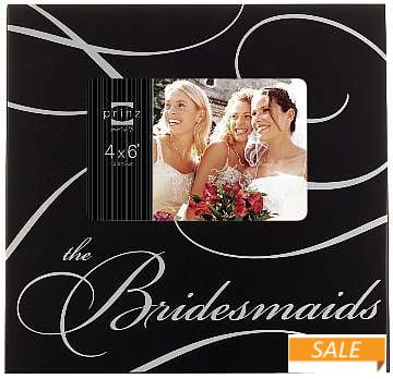 Product Details Prinz® frames & albums The BRIDESMAIDS wood frame by Prinz — Proudly display your wedding party Bridesmaids photo in this elegant frame. Black with a screen printed white swirl design and the words "the Bridesmaids". Holds one 6" x 4" horizontal photograph. By Prinz®, maker of fine frames & albums for generations. The BRIDESMAIDS wood frame by Prinz Model #086981761130 List $24.50 You pay $11.90 In stock Ships next business day [?] Your Price Match is Active Your request for a price of $0.00 for a minimum quantity of has been accepted. You have [time] left to purchase this item for $0.00 instead of $11.90 each. Find a Lower Price? We BEAT All Authorized Retailers [?] FEATURESDisplays:4"x6"Material:Wood (full grain)Finish:BlackOccasion:WeddingStyle:Classic, Contemporary, Sophisticated, Words & whimsy, Sentiments | ready madeOrientation:Horizontal OnlyBrand:Prinz® frames & albums Approx. Overall Dimensions:7 5/8"x6 3/8"x1/2" This item ships in its own box SHARE THIS ITEM Share on Facebook