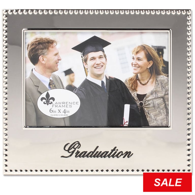 Main view Angled Reverse Product Details Lawrence Frames® GRADUATION special engraved celebration 6x4 frame — A brilliant gift to celebrate the Grad - the special silverplate Graduation picture frame. Glare resistant glass lens. Easel back for tabletop display. By Lawrence®. GRADUATION special engraved celebration 6x4 frame Model #751148071079 List $24.50 You pay $10.90 This item IS in stock and can be expected to ship 01/28/2026 In stock Your Price Match is Active Your request for a price of $0.00 for a minimum quantity of has been accepted. You have [time] left to purchase this item for $0.00 instead of $10.90 each. Find a Lower Price? We BEAT All Authorized Retailers [?] FEATURESDisplays:4"x6"Material:SilverplateFinish:SilverOccasion:GraduationStyle:Classic, Contemporary, Traditional, Words & whimsy, Sentiments | ready madeOrientation:Horizontal OnlyBrand:Lawrence Frames®Display Type:Tabletop (or wall w/optional hanger - available separately) Approx. Overall Dimensions:7 1/2"x5 7/8"x7/8" This item ships in its own box SHARE THIS ITEM Share on Facebook