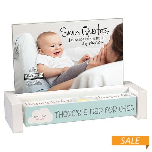 Main view Product Details Malden Designs® BABY SPIN QUOTES 4x6 frame — Celebrate the new BABY with this special spin-quote frame. Love you to the moon and back You are my sunshine There's a nap for that Happy baby ... Happy life A unique desktop gift waiting for your special baby frame. This novelty frame is produced by Malden USA®. BABY SPIN QUOTES 4x6 frame Model #096287169882 List $18.00 You pay $7.90 In stock Can be shipped today [?] Your Price Match is Active Your request for a price of $0.00 for a minimum quantity of has been accepted. You have [time] left to purchase this item for $0.00 instead of $7.90 each. Find a Lower Price? We BEAT All Authorized Retailers [?] FEATURESDisplays:4"x6"Material:Wood (mdf/engineered)Finish:Turquoise, WhiteOccasion:Baby shower, Grandparent`s Day, New babyStyle:Contemporary, Words & whimsy, Sentiments | ready madeOrientation:Horizontal OnlyBrand:Malden Designs®Display Type:Desktop Only Approx. Overall Dimensions:7"x5 1/4"x2 1/2" This item ships in its own box SHARE THIS ITEM Share on Facebook