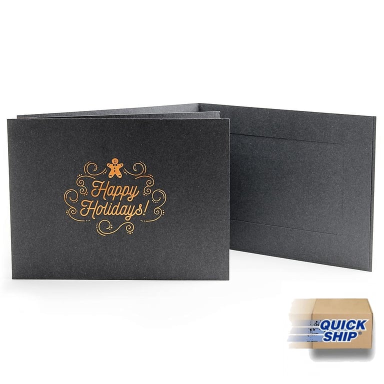 Our photo folder in black, accented with Gingerbread Man - Happy Holidays! in metallic foil. Design is hot stamped (imprinted) onto the front of the folder as shown.