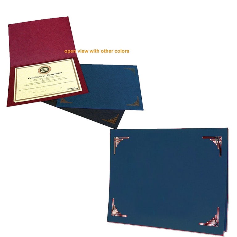 Main view 125 Sample (Blue) w/Logo Print Product Details Collectors Gallery Blue Certificate Folders for 10x8 or 11x8½ Certificates (sold in 25s) — BLUE Linen weave paper stock and rich gold foil make this certificate folder an elegant yet inexpensive solution for presenting & holding awards and certificates. Super sturdy 80# (approx 12pt) cover stock construction. Inside each fold-over certificate holder, there are half moon die-cut tabs to hold either an 8"x10" or an 8½" x 11" document. Please note that the corner design is pre-stamped on the front of each folder. You may add additional imprinting with your logo or name in foil (available separately). Individually priced; sold in 25's. Blue Certificate Folders for 10x8 or 11x8½ Certificates (sold in 25s) Model #021352058921 $46.25 ( set of 25 / $1.85 ea ) This item can be expected to ship by 02/25/2026. Order now by clicking ADD TO CART (below); you are only charged when we actually ship. Or, Click here to be automatically notified when it comes back in stock. Your Price Match is Active Your request for a price of $0.00 for a minimum quantity of has been accepted. You have [time] left to purchase this item for $0.00 instead of $1.85 each. Find a Lower Price? We BEAT All Authorized Retailers [?] FEATURESDisplays:8.50"x11"Material:Card-stockFinish:BlueOccasion:Corporate gifts, Group Events + Parties, Thank-Motivate-RewardStyle:Traditional, Travel Ready, Minimal, Eco-Friendly-RecycledOrientation:Horizontal OnlyBrand:Collectors GalleryDisplay Type:not applicable n/a SHARE THIS ITEM Share on Facebook