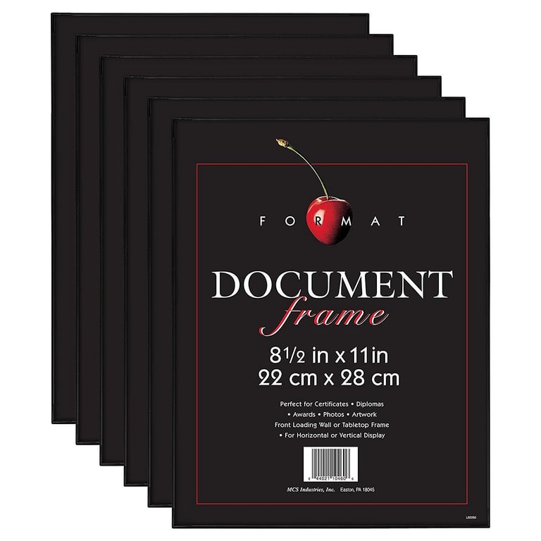 Back to results Scroll Items 8177 of 11170 Main view Reverse The Series Product Details MCS® (6-Pack) The ORIGINAL FORMAT FRONT-LOAD Black 8½x11 Frame — Pack of 6 - The Original FORMAT 8½"x11" frame - a terrific document and photo frame for volume users. Features Front Loading easy access to your print or photo.Attractive black ABS plastic moulding with ultra-clear, polished edge glare resistant glass lens. Snap-in easel back for portrait or landscape table-top display. Can be wall mounted too. By MCS®. Here's a video of the FORMAT frame use: (6-Pack) The ORIGINAL FORMAT FRONT-LOAD Black 8½x11 Frame Model #663593186133 List $53.00 You pay $43.95 In stock Ships next business day [?] Your Price Match is Active Your request for a price of $0.00 for a minimum quantity of has been accepted. You have [time] left to purchase this item for $0.00 instead of $43.95 each. Find a Lower Price? We BEAT All Authorized Retailers [?] Approx. Overall Dimensions:8 5/8"x11 1/8"x5/8" SHARE THIS ITEM Share on Facebook