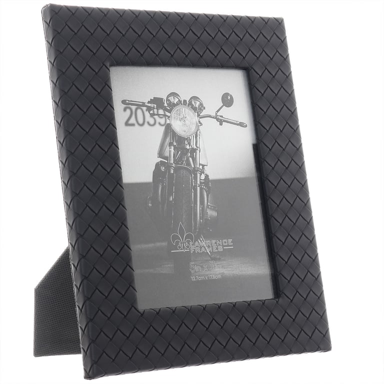 Main view Product Details Lawrence Frames® WOVEN Black bonded leather 5x7 frame — Beautifully crafted in black bonded woven pattern leather.Glare resistant glass lens. Easel back for portrait or landscape tabletop display. Wall mounts for easy hanging.By Lawrence Frames. WOVEN Black bonded leather 5x7 frame Model #751148089357 List $26.00 You pay $20.95 This item IS in stock and can be expected to ship 11/26/2025 Your Price Match is Active Your request for a price of $0.00 for a minimum quantity of has been accepted. You have [time] left to purchase this item for $0.00 instead of $20.95 each. Find a Lower Price? We BEAT All Authorized Retailers [?] Approx. Overall Dimensions:7 5/8"x9 5/8"x3/4" This item ships in its own box SHARE THIS ITEM Share on Facebook