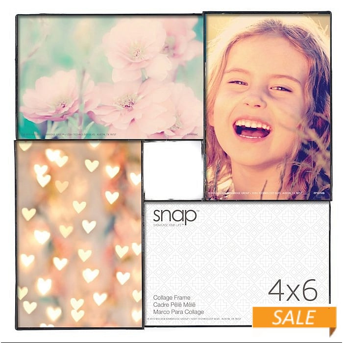 Product Details SNAP BLACK Collage frame for (4) 4x6 prints by SNAP™ — Show-off your prints in this attractive "3-D" profile collage frame. Displays (4) 4x6 prints.Easel back for tabletop display. Wall mounts are permanently attached to the backing, out of sight. Glare resistant glass lens. Crafted by SNAP™. BLACK Collage frame for (4) 4x6 prints by SNAP™ Model #038555343334 List $24.00 You pay $12.90 In stock Your Price Match is Active Your request for a price of $0.00 for a minimum quantity of has been accepted. You have [time] left to purchase this item for $0.00 instead of $12.90 each. Find a Lower Price? We BEAT All Authorized Retailers [?] FEATURESDisplays:4"x6"Material:Acrylic | ResinFinish:BlackOccasion:Friendship, Grandparent`s Day, Home decorating, Housewarming, Teacher gifts, Team & coach gifts, Thank-Motivate-Reward, Celebrating TravelsStyle:Architectural, Contemporary, MinimalOrientation:BothBrand:SNAPDisplay Type:Desktop or Wall Approx. Overall Dimensions:10"x10"x1 3/8" This item ships in its own box SHARE THIS ITEM Share on Facebook