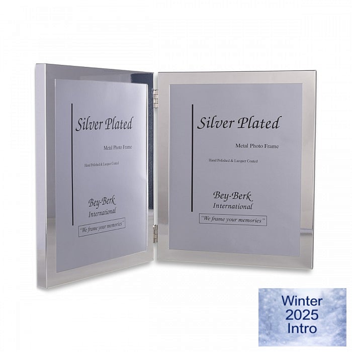 Product Details Bey-Berk Engraveable polished 1-in silverplate 8x10 Double Hinged frame — Wide 1'' border silverplate frame, polished to a mirror finish, displays 2 8x10" prints. Extremely high quality, very comparable to more expensive silverplate frames from Italy. Slide-in channel black felt backs for desktop display. Wall-mounts also included for easy hanging. Glare resistant glass lenses. Ships in a protective gift box.Click Personalize this item for more information. A great new choice we now stock.Crafted by Bey-Berk®. Engraveable polished 1-in silverplate 8x10 Double Hinged frame BEY-BERK® WINTER CELEBRATION SAVINGS - Buy More / Save More * Add this item to your cart for the full details of this promotion. Conditions may apply. Model #797140220077 List $125.00 You pay $108.95 In stock Ships next business day [?] Your Price Match is Active Your request for a price of $0.00 for a minimum quantity of has been accepted. You have [time] left to purchase this item for $0.00 instead of $108.95 each. Find a Lower Price? We BEAT All Authorized Retailers [?] FEATURESDisplays:8"x10"Material:SilverplateFinish:SilverOccasion:Congratulations, Graduation, Mother`s Day, Housewarming, Inspirational, Thank-Motivate-Reward, Birthday, Corporate giftsStyle:Classic, Minimal, Traditional, GlamOrientation:Vertical OnlyBrand:Bey-BerkDisplay Type:Desktop or Wall Approx. Overall Dimensions:17 1/8"x10 1/8"x3/4" This item ships in its own box SHARE THIS ITEM Share on Facebook