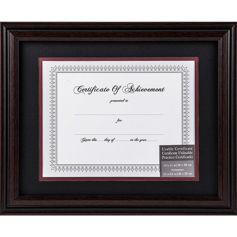 Product Details Gallery Solutions™ Rosewood and Black Certificate 14x11/11x8½ Matted frame by Gallery Solutions® — A two-tone black and rose wood-like frame is a handsome look for displaying certificates and diplomas.Protects an 11"x8½" print or certificate; a 14"x11" without mat. Glare resistant glass lens. Hanging hardware included for easy wall mounting.Crafted and finished with years of service in mind.Produced by Gallery Solutionsr® - the document care people. Rosewood and Black Certificate 14x11/11x8½ Matted frame by Gallery Solutions® Model #038555475783 $25.95 only 2 left, order soon. In stock Ships next business day [?] Your Price Match is Active Your request for a price of $0.00 for a minimum quantity of has been accepted. You have [time] left to purchase this item for $0.00 instead of $25.95 each. Find a Lower Price? We BEAT All Authorized Retailers [?] FEATURESDisplays:8.50"x11"Material:Wood (mdf/engineered)Finish:Black, BurgundyOccasion:Business & office, GraduationStyle:Classic, Traditional, SophisticatedOrientation:BothBrand:Gallery Solutions™Display Type:Wall Only Approx. Overall Dimensions:16 1/8"x13 1/4"x3/4" This item ships in its own box SHARE THIS ITEM Share on Facebook