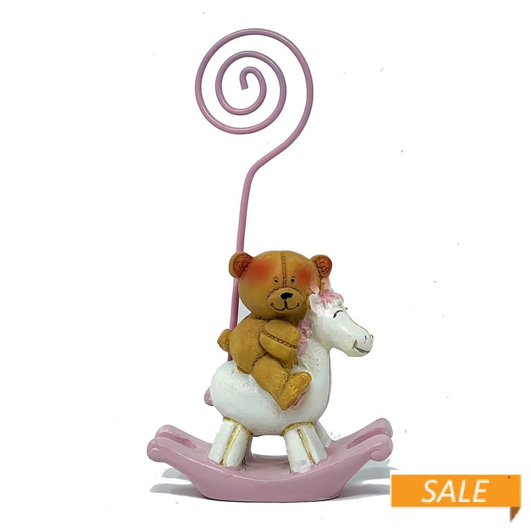 Main view Product Details Fashioncraft-Excello Adorable pink & white rocking teddy placecard clip — Treat your baby shower guests to table accessory place clip frames that will be a terrific conversation starter.Pink & white rocking horse with adorable, articulated teddy.Priced individually; sold in prepacks of 3 pieces.Made expressly for SendAFrame. Adorable pink & white rocking teddy placecard clip Model #638054038405 List $7.50 You pay $3.57 ( set of 3 / $1.19 ea ) In stock Can be shipped today [?] Your Price Match is Active Your request for a price of $0.00 for a minimum quantity of has been accepted. You have [time] left to purchase this item for $0.00 instead of $1.19 each. Find a Lower Price? We BEAT All Authorized Retailers [?] FEATURESMaterial:Acrylic | ResinFinish:Pink, WhiteOccasion:Baby shower, Birthday (child), Group Events + Parties, New babyStyle:Contemporary, Bears & BunniesBrand:Fashioncraft-ExcelloDisplay Type:not applicable n/a This item ships in its own box SHARE THIS ITEM Share on Facebook
