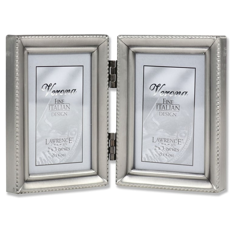Main view Product Details Lawrence Frames® Satin pewter hinged 2x3 double w/caviar bead trim — Beaded antiqued pewter frame is nicely crafted with invisible seams and corner joints.Attractively backed for wonderful desk appeal. Glare resistant glass lenses. Edge measures 3/8" wide all around.Produced by Lawrence®. Satin pewter hinged 2x3 double w/caviar bead trim Model #48035040 List $24.50 You pay $17.95 In stock Can be shipped today [?] Your Price Match is Active Your request for a price of $0.00 for a minimum quantity of has been accepted. You have [time] left to purchase this item for $0.00 instead of $17.95 each. Find a Lower Price? We BEAT All Authorized Retailers [?] FEATURESDisplays:2"x3"Material:Pewter (plate)Finish:SilverOccasion:Anniversary, Birthday, Good luck, Mother`s Day, Retirement, Romantic, Teacher gifts, Thank-Motivate-Reward, Celebrating Travels, WeddingStyle:Antique, Classic, Traditional, RomanticOrientation:Vertical OnlyBrand:Lawrence Frames®Display Type:Desktop or Wall This item ships in its own box SHARE THIS ITEM Share on Facebook
