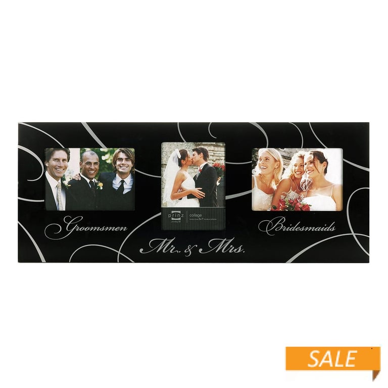 Product Details Prinz® frames & albums The WEDDING PARTY Collage wood frame by Prinz® — Proudly display your wedding party photo in this elegant frame. Black with a screen printed white swirl design and the words: Groomsmen Mr. & Mrs. Bridesmaids Holds three (3) 7"x5" photos. Produced by Prinz® maker of fine frames & albums for generations. The WEDDING PARTY Collage wood frame by Prinz® Model #086981761154 List $54.00 You pay $24.90 In stock Can be shipped today [?] Your Price Match is Active Your request for a price of $0.00 for a minimum quantity of has been accepted. You have [time] left to purchase this item for $0.00 instead of $24.90 each. Find a Lower Price? We BEAT All Authorized Retailers [?] FEATURESDisplays:5"x7"Material:Wood (full grain)Finish:BlackOccasion:Romantic, WeddingStyle:Classic, Contemporary, Sophisticated, Words & whimsy, Sentiments | ready madeOrientation:Horizontal OnlyBrand:Prinz® frames & albums This item ships in its own box SHARE THIS ITEM Share on Facebook