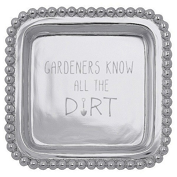 Main view Gift Packaging Product Details Mariposa® GARDENERS KNOW ALL THE DIRT - PEARLED 4in TRAY crafted by Mariposa® — Mariposa's String of Pearls collection, handcrafted from 100% recycled aluminum forms this multi-functional, elegant Canape Plate. Engraved with the expression: GARDENERS KNOW ALL THE DIRT Material: Recycled Sandcast Aluminum Dimensions: 4¼in L x 4¼in W Important Note: Mariposa pieces are hand engraved; please expect slight differences from the photo. GARDENERS KNOW ALL THE DIRT - PEARLED 4in TRAY crafted by Mariposa® Mariposa® HOLIDAY CELEBRATION Savings - Buy More / Save More * Add this item to your cart for the full details of this promotion. Conditions may apply. Model #8088131092GA List $38.00 You pay $34.95 In stock Ships next business day [?] Your Price Match is Active Your request for a price of $0.00 for a minimum quantity of has been accepted. You have [time] left to purchase this item for $0.00 instead of $34.95 each. Find a Lower Price? We BEAT All Authorized Retailers [?] FEATURESMaterial:AluminumFinish:SilverOccasion:Birthday, Friendship, Good luck, Inspirational, Mother`s Day, Thank-Motivate-RewardStyle:Contemporary, Eco-Friendly-Recycled, Modern, Santa Fe, Shabby Chic, Sports & leisure, Words & whimsy, Sentiments | ready madeBrand:Mariposa®Display Type:not applicable n/a Approx. Overall Dimensions:4 1/4"x4 1/4" This item ships in its own box SHARE THIS ITEM Share on Facebook